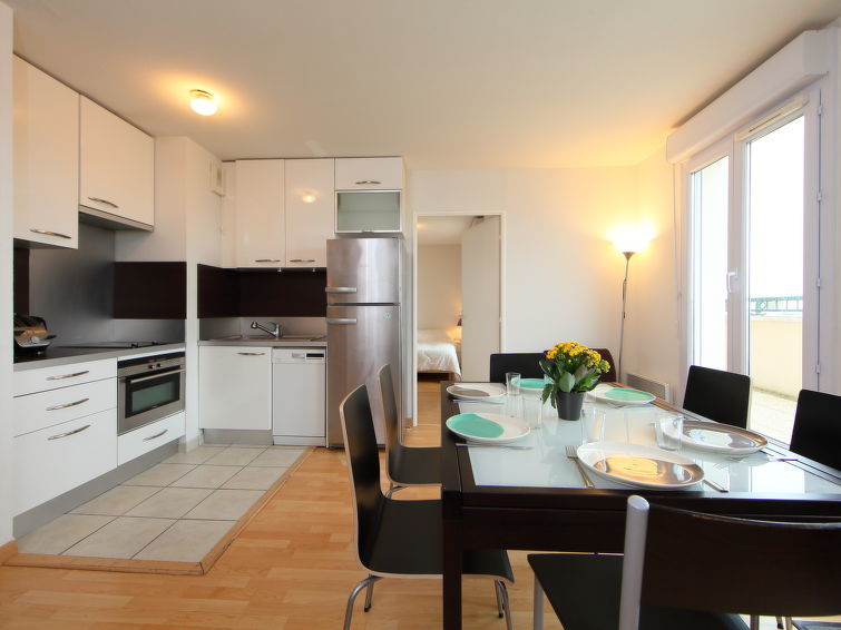 Appartement 4-kamers 66 m2 op 2 verdiepingen op de 5e verdieping, op het noordwesten gelegen. Woon-/eetkamer met TV, Flatscreen TV, stereo-installatie en DVD. Uitgang naar het terras. 1 kamer met 1 2-pers bed (140 cm, lengte 190 cm), douche. Uitgang naar het terras. Kookhoek (afwasmachine, 2 keramische glas kookplaten, broodrooster, waterkoker, elektrische koffiemachine). Aparte WC. Elektrische verwarming, boiler. Bovenverdieping: 1 kamer met afgeschuinde daken met 1 2-pers divanbed (160 cm, lengte 200 cm), TV (Flatscreen TV). 1 kamer met afgeschuinde daken met 1 x 2 stapelbedden (90 cm, lengte 190 cm). Bad/WC. Elektrische verwarming. Parketvloeren. Terras 20 m2, op het noordwesten gelegen. Terrasmeubelen. Panoramazicht op zee, het landschap en de rivier. Ter beschikking: wasmachine. Internet (Internet (WiFi), gratis). Parkeerplaats nr. 1843 (overdekt). Rookmelders.